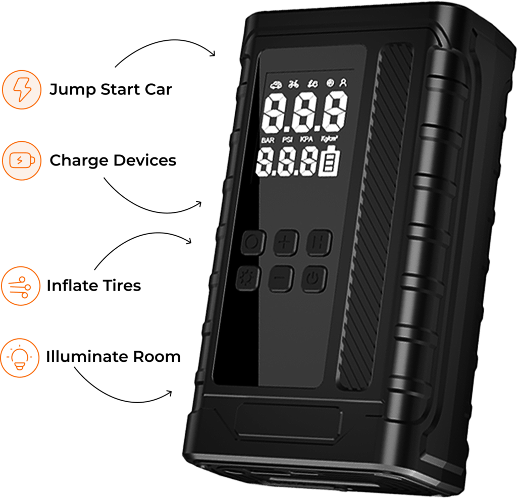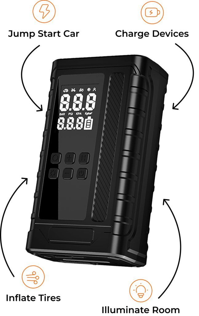Jump-start your car, charge your devices, light your path, and stay prepared for anything — all with one compact, powerful device.
